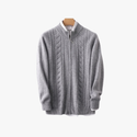 A sophisticated knit sweater with a full zip closure and intricate cable-knit patterns. Designed with a high collar and ribbed cuffs for a snug, polished fit, offering both warmth and timeless style for cooler days.